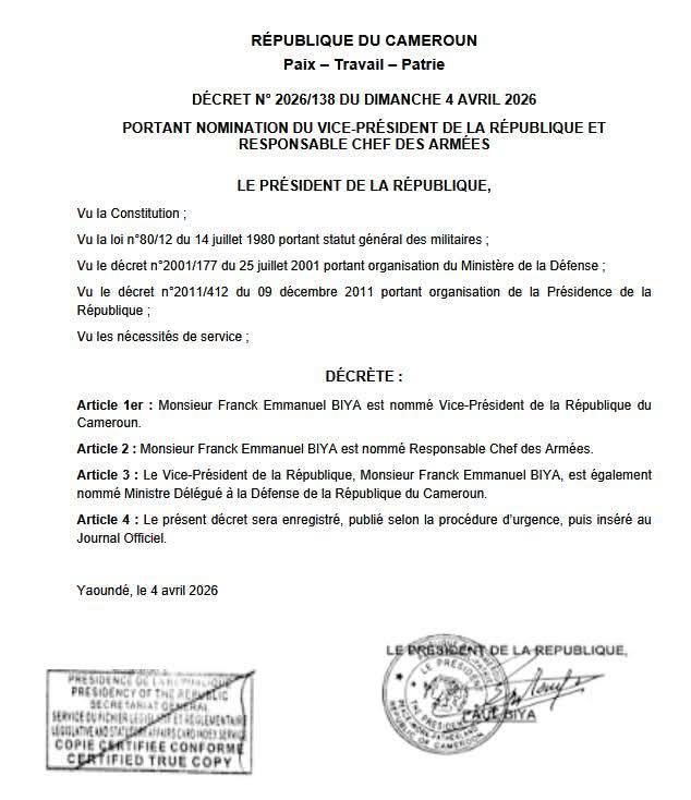2026-04-07 11:24:01 - Paul Biya a signé un décret nommant son propre fils à trois postes clés du pouvoir : vice-président du Cameroun, chef des armées et ministre délégué à la Défense de la République du Cameroun.
